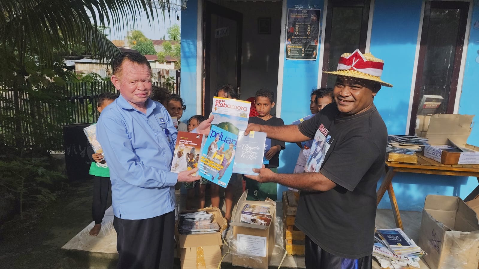 Paket bantuan berupa majalah dan buku sejarah perjalanan koperasi diterima langsung oleh pengelola komunitas, Yanto de Flores, beserta anak-anak warga belajar.