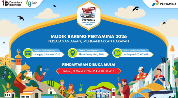 Pendaftaran program Mudik Bareng Pertamina 2026 dibuka mulai Selasa, 3 Maret 2026 pukul 10.00 WIB melalui laman resmi www.mudikpertamina2026.com.