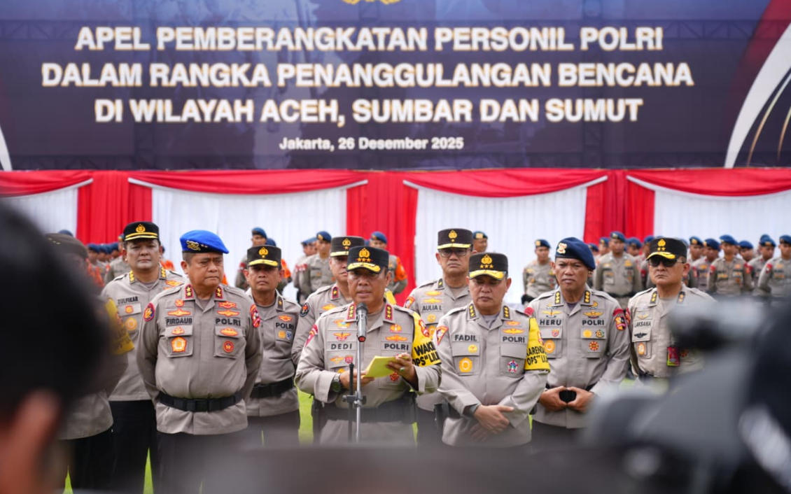 PeluangNews, Jakarta – Wakapolri Komjen Pol Prof. Dr. Dedi Prasetyo menegaskan komitmen Polri untuk terus hadir di tengah masyarakat melalui apel pemberangkatan personel Polri dalam rangka penanggulangan bencana di Aceh, Sumatera Utara, dan Sumatera Barat. Apel digelar di Lapangan Bhayangkara Mabes Polri, Jumat (26/12/2025).